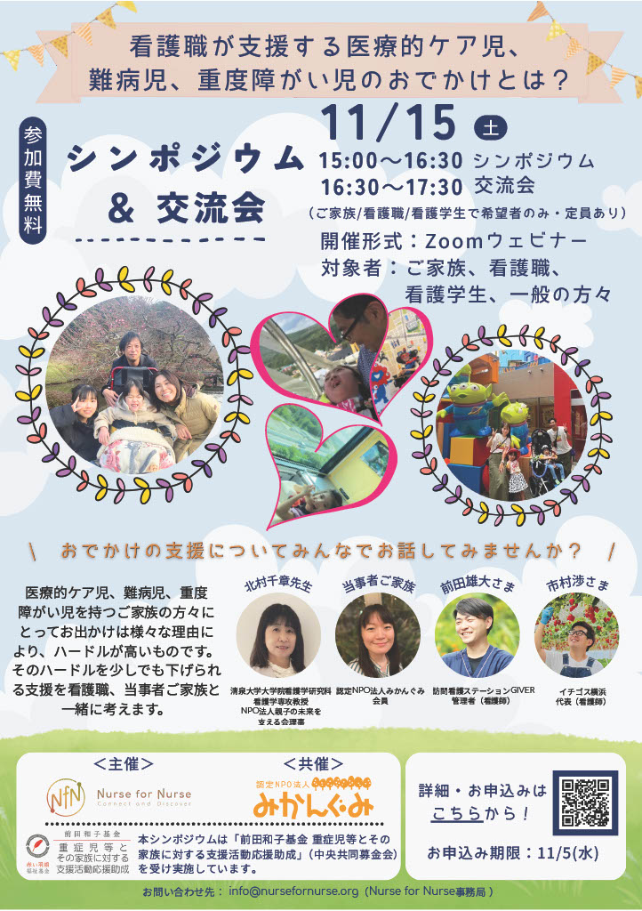 医療的ケア児や難病児、重度障がい児にとって外出は大きなハードルがあります。その支援をご家族と看護職が共に考えるシンポジウム/交流会を開催します。ご家族の視点から支援の必要性や課題を共有し、外出支援に取り組む看護職の実践についてお話を伺い、子どもたちへの支援に向け看護職の関心を高め、課題等を整理します。